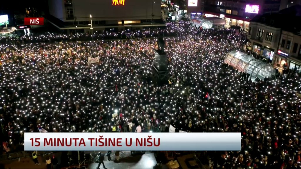 11.52 Studenti i građani u centru Niša tišinom u trajanju od 15 minuta odaju poštu za 15 poginulih pri padu betonske nadstrešnice na rekonstruisanoj Železničkoj stanici u Novom Sadu. Samo se čuju dronovi i zvono sa crkve, javljaju novinari Danasa iz Niša.