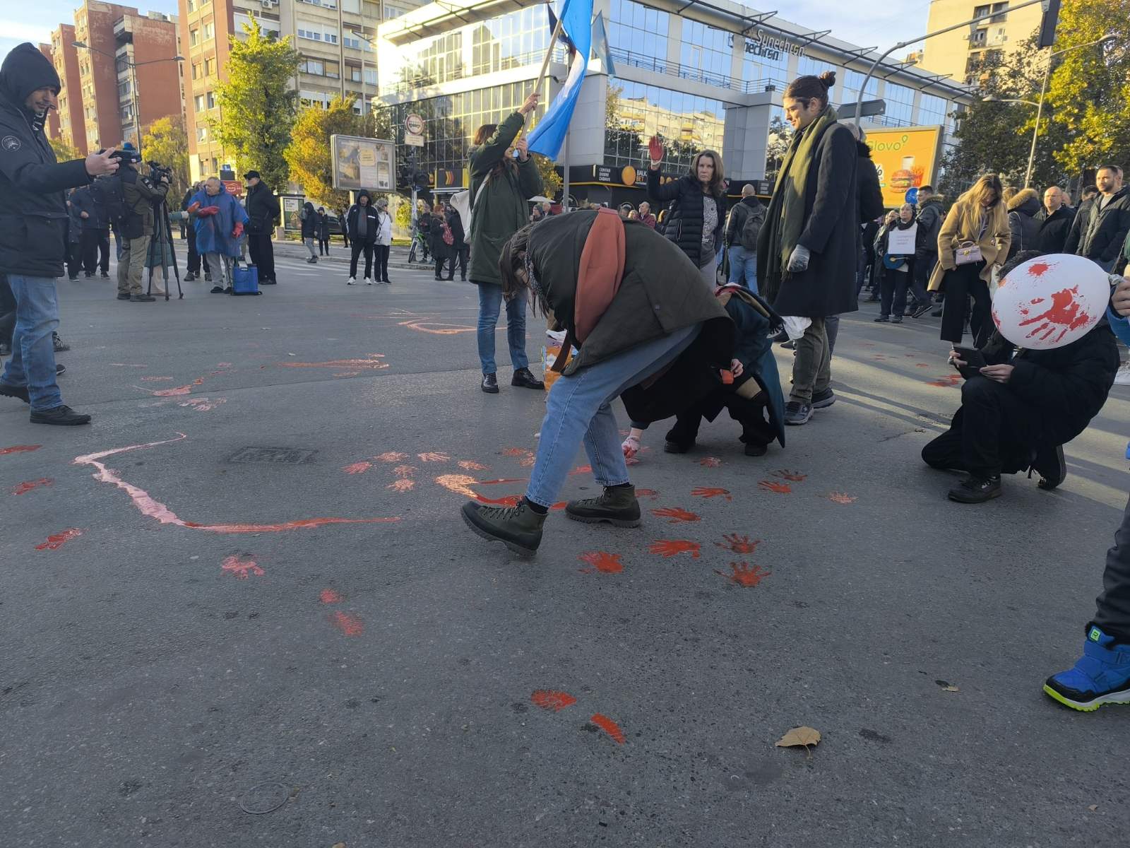 Počela je protestna akcija Bulevarom oslobođenja od Železničke stanice. Aktivisti crvenom bojom po kolovozu ispisuju poruke „ubice“ „ruke su vam krvave“ i ostavljaju otiske šaka pic.twitter.com/mTP1ErI5FM