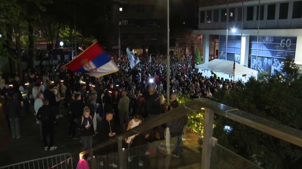 Foto: N1Nekoliko hiljada ljudi učestvuje u studentskoj blokadi zgrade Radio televizije Srbije (RTS), u Takovskoj ulici, u Beogradu, koja je ušla u petu noć.Sasvim je ispunjen prostor od Svetogorske ulice go Glavne pošte. Skup protiče bez uobičajene buke, zbog Velikog petka, javlja izveštač Bete sa lica mesta.