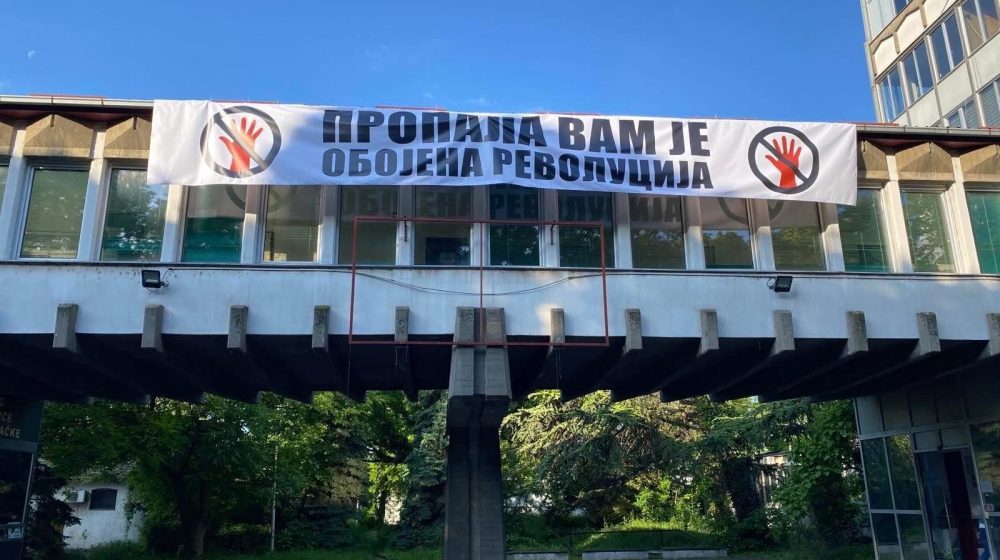 Građani na protestu su skinuli i zapalili ovaj transparent, prenosi N1.