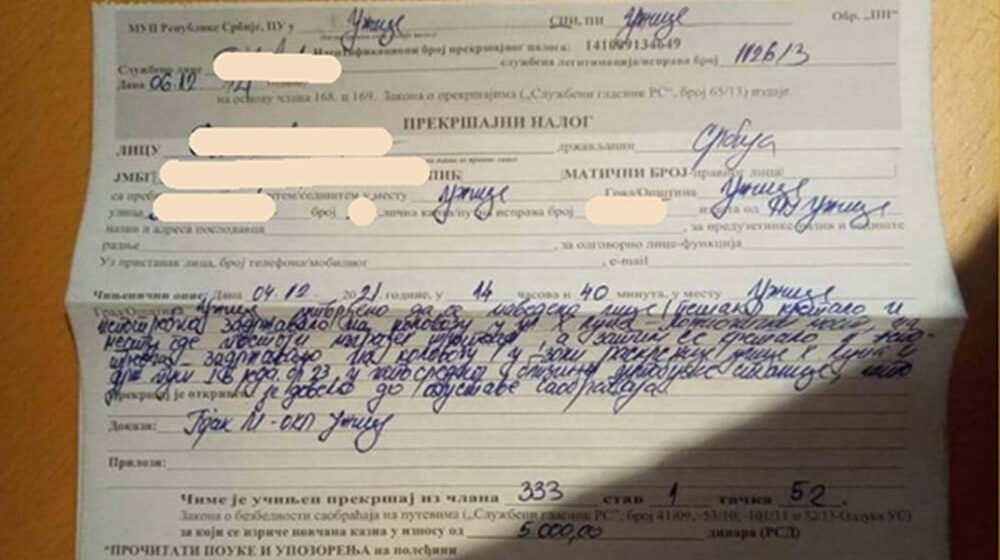 Prijava/Foto: Privatna arhivaUžički odbori Stranke slobode i pravde i Demokratske stranke su saopštli da brojni Užičani „od jutros dobijaju od policije prekršajne prijave, zbog učešća u blokadi saobraćajnica, te da su „društvene mreže zapljusnute fotografijama tih prijava“.
