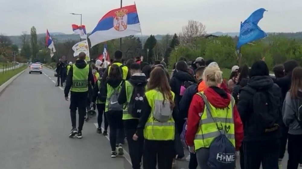 Foto FoNet Miki JevtovićStudenti i srednjoškolci u okviru „Marša na Drinu“ iz Bogatića su oko 9 sati nastavlili pešačenje prema Loznici gde će biti održan protest u petak.