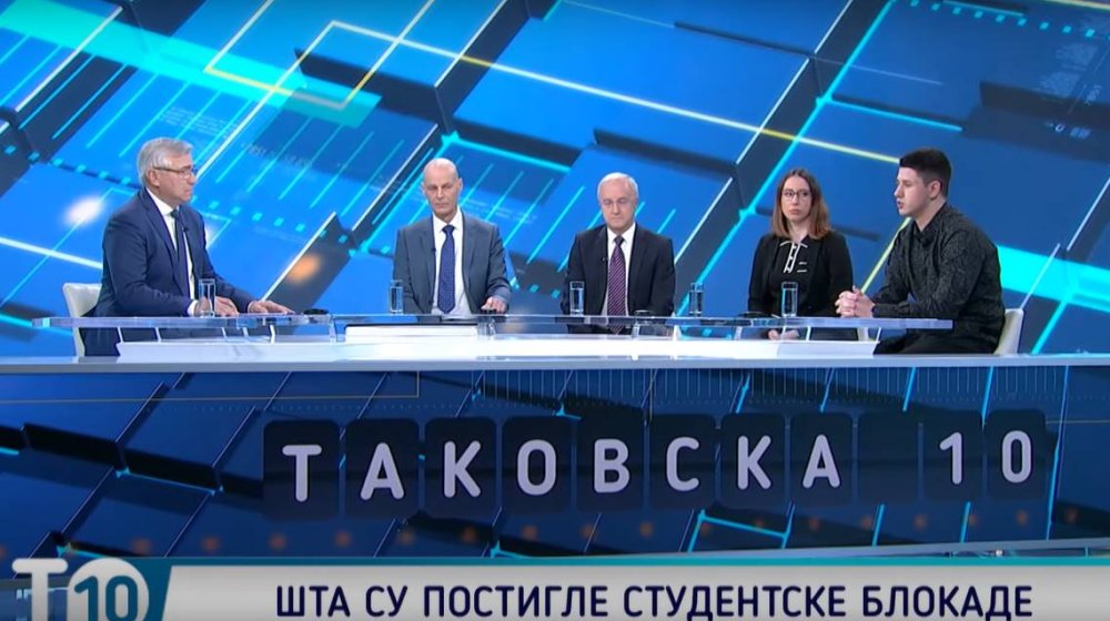 Izvor: Youtube (@RTSSajtZvanicniKanal)Da li su ispunjeni studentski uslovi, treba li studenti da prihvate ponuđeni dijalog, koji su putevi iz društvene i političke krize u Srbiji – u emisiji Takovska 10 na RTS-u su govorili Miloš Pavlović, dekan FDU u Beogradu, Milan Jovanović, profesor FPN u Beogradu, Ela Zeković, studentkinja i predstavnica plenuma FPN-a, i Miloš Pavlović, student Medicinskog fakulteta u Beogradu.