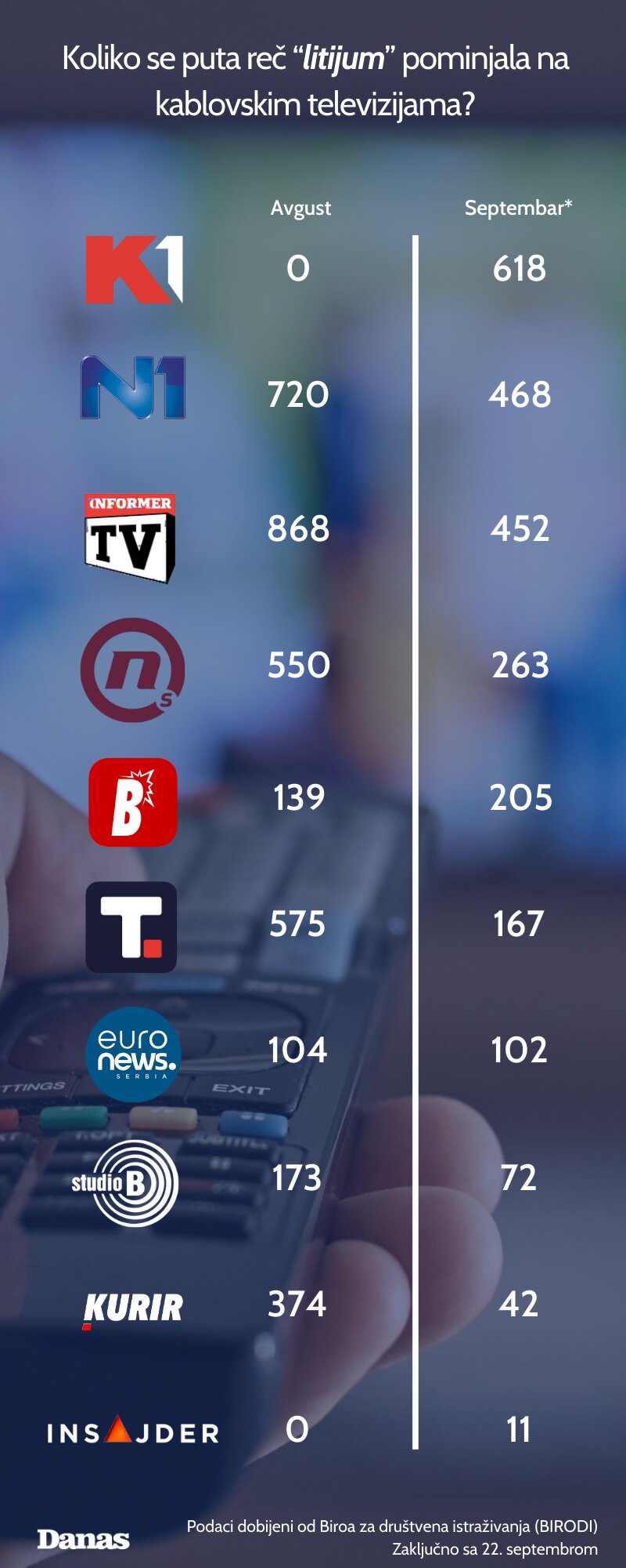 Po statistikama, kako objašnjava izvršni direktor BIRODI-a, tema litijuma dominira na N1 i Novoj S, ali najviše priloga u avgustu imala je “Informer TV”.