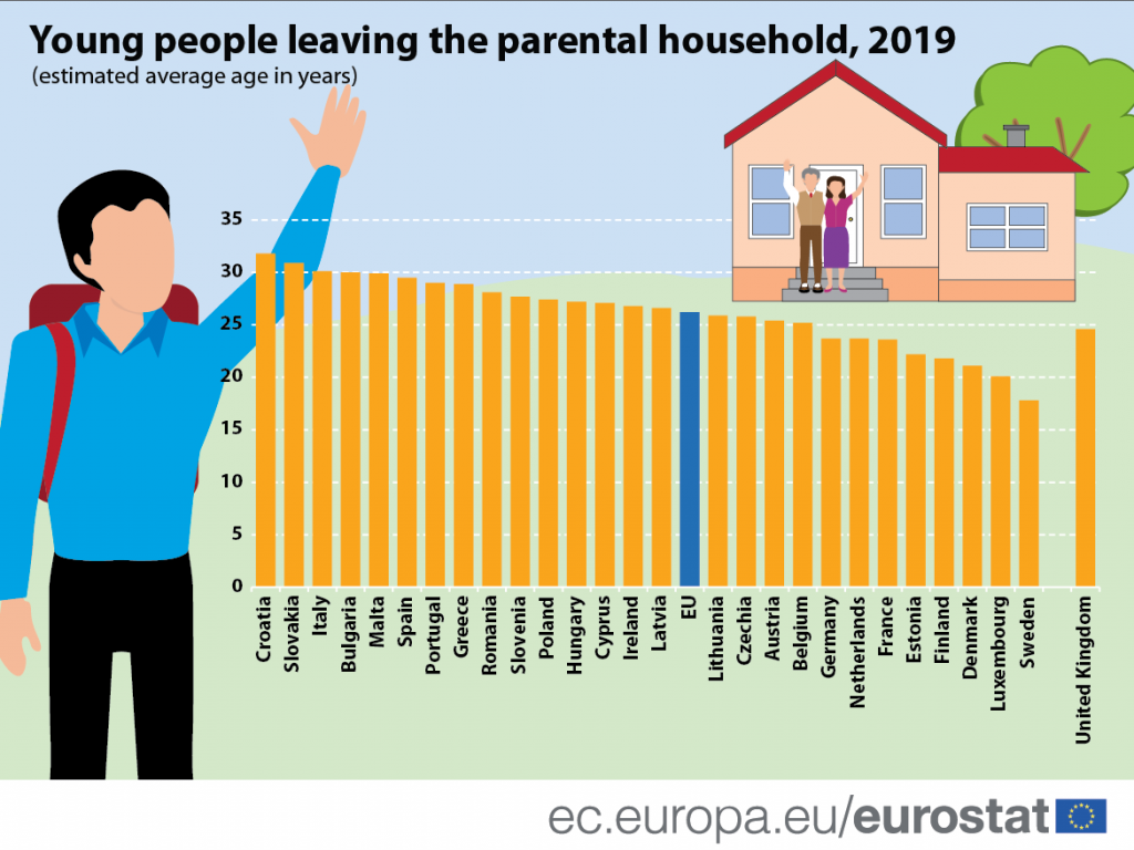 Tokom 2019. godine, procenat mladih starosne dobi od 25 do 34 godine koji su živeli sa svojim roditeljima razlikovao se širom država članica EU – manje od 10 odsto u Danskoj (4 odsto), Finskoj (4.8 odsto) i Ševdskoj (5.7 odsto), pa sve to više od 50 odsto u zemljama kao što su Slovačka (56.4 posto tokom 2018. godine), Grčka (57.8 odsto) i Hrvatska (62 odsto).