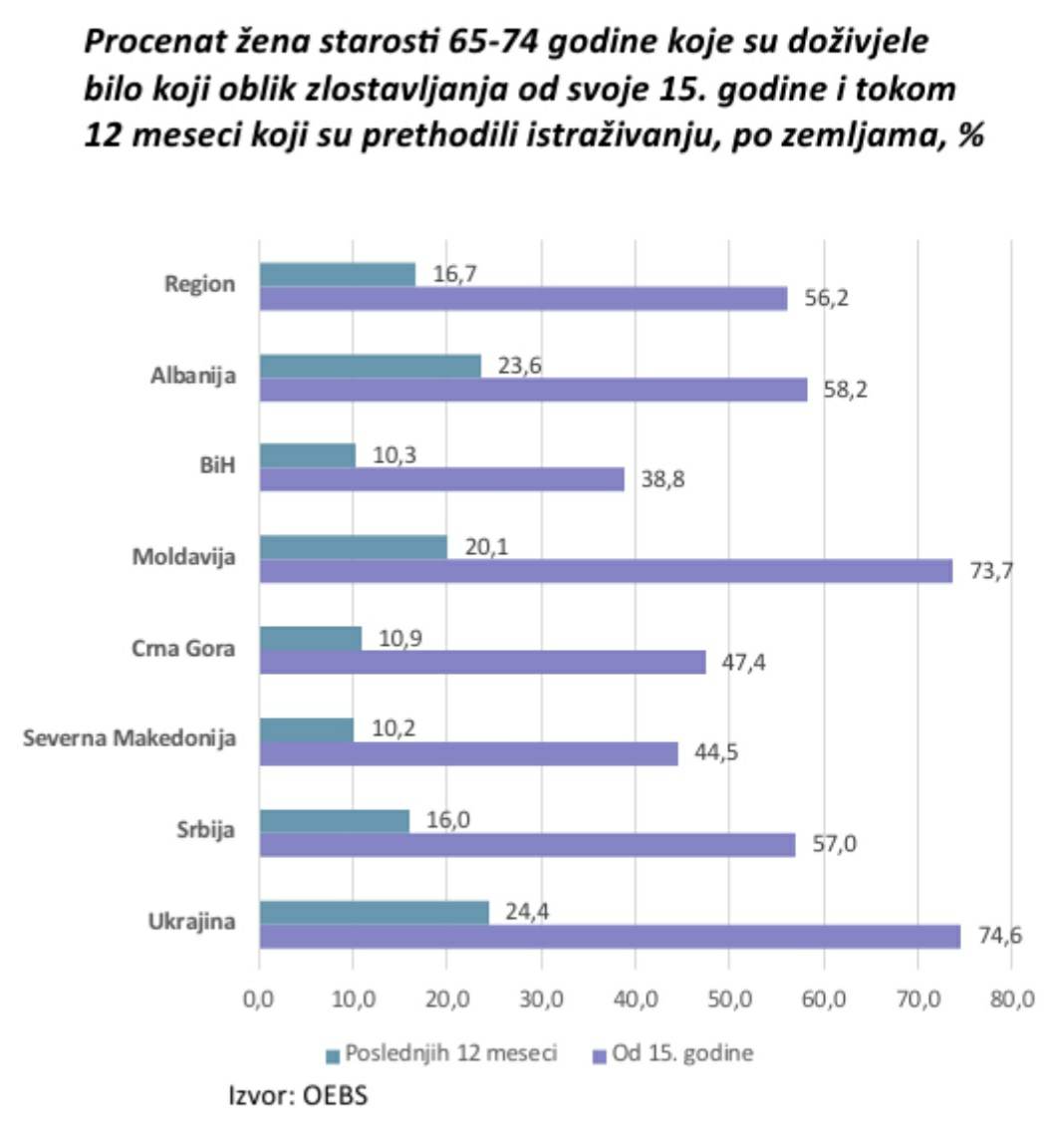 Nataša Todorović iz Crvenog krsta Srbije rekla je da se ovo regionalno istraživanje, koje je obuhvatilo 15.000 žena odnosi na Albaniju, Srbiju, Crnu Goru, BiH, Makedoniju, Moldaviju i Ukrajinu, a da je najmanje nasilja nad starijim ženama zabeleženo u BiH (38,8 odsto, u poslednjih godinu dana 10,3).