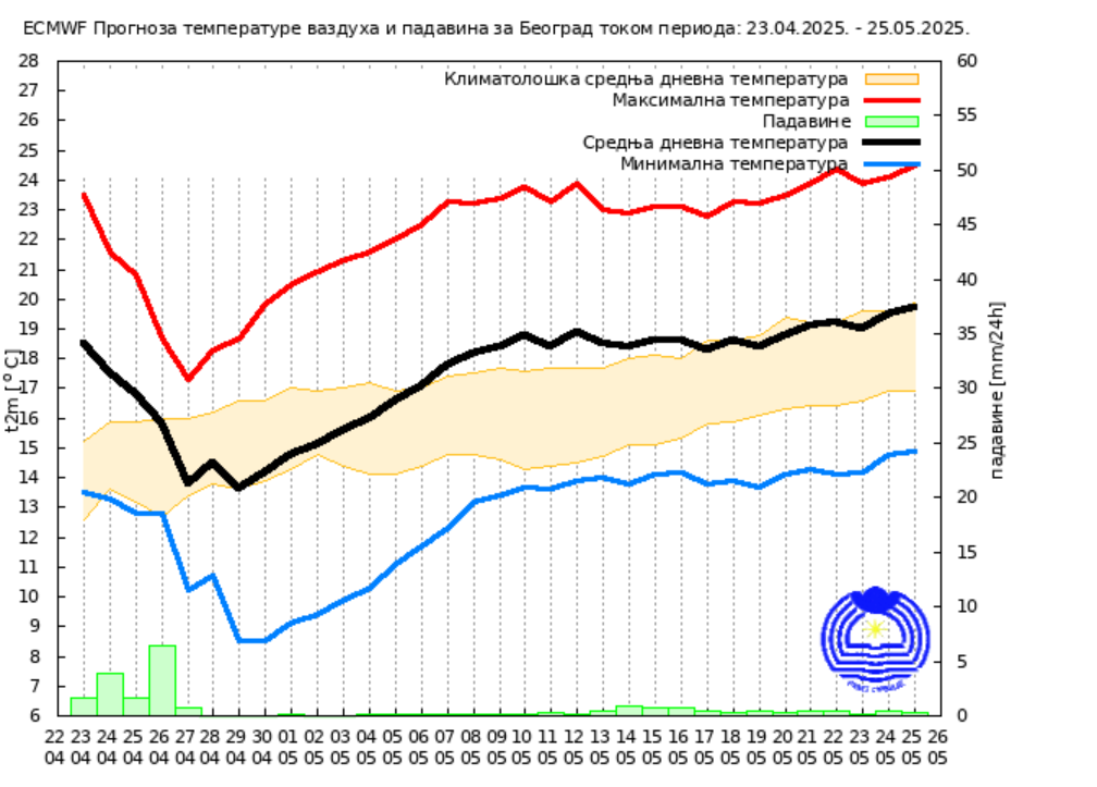 Kako pokazuje grafikon mesečne vremenske prognoze RHMZ, u Beogradu će 1. maja najniža dnevna temperatura biti 9 stepeni, a najviša dnevna 21, uz manje padavine između 1. i 2 maja. Subota 3. maj ne bi trebalo da bude kišovita, dok se za nedelju 4. maja očekuju padavine, ali i najviša dnevna temperatura od 22 stepena.