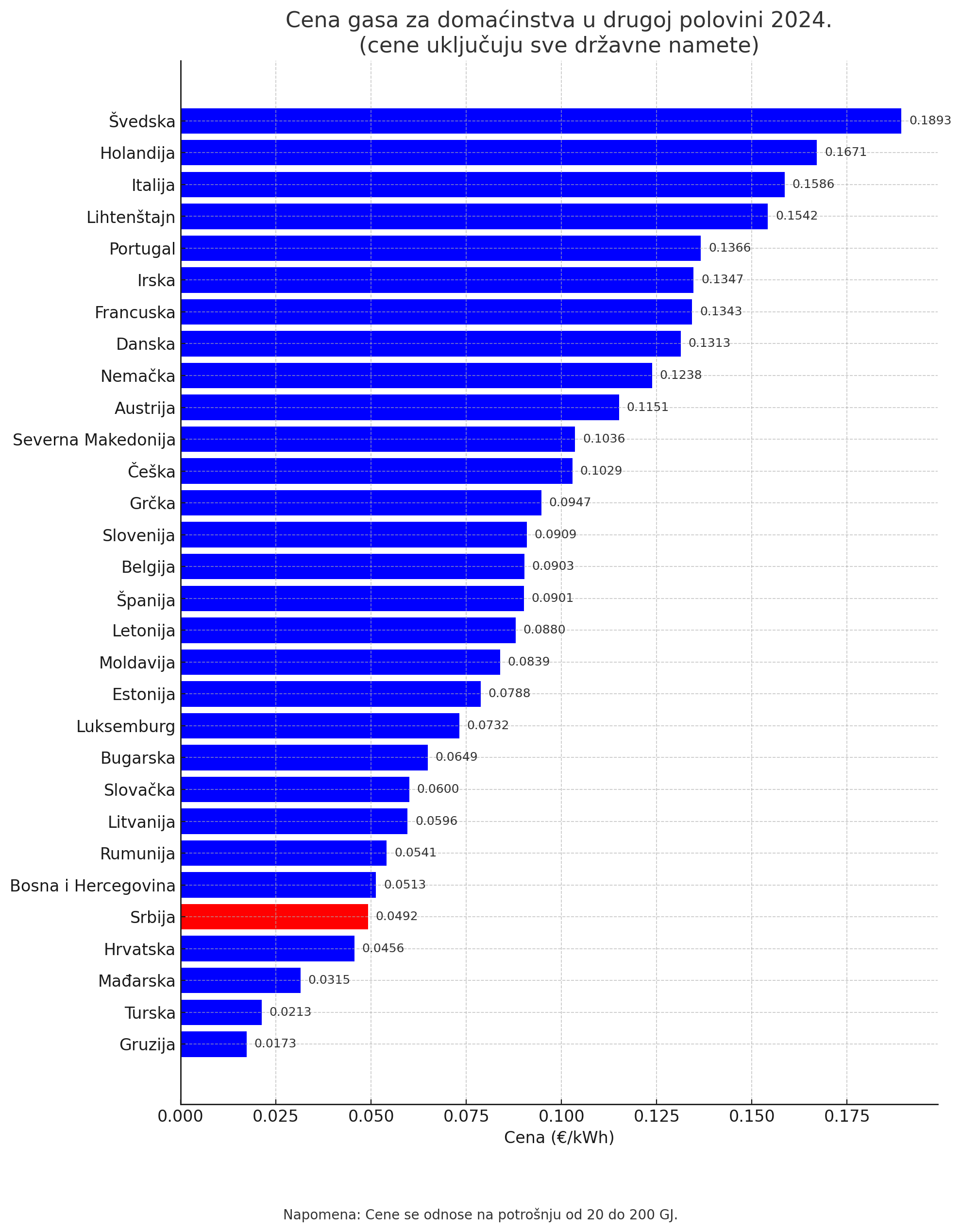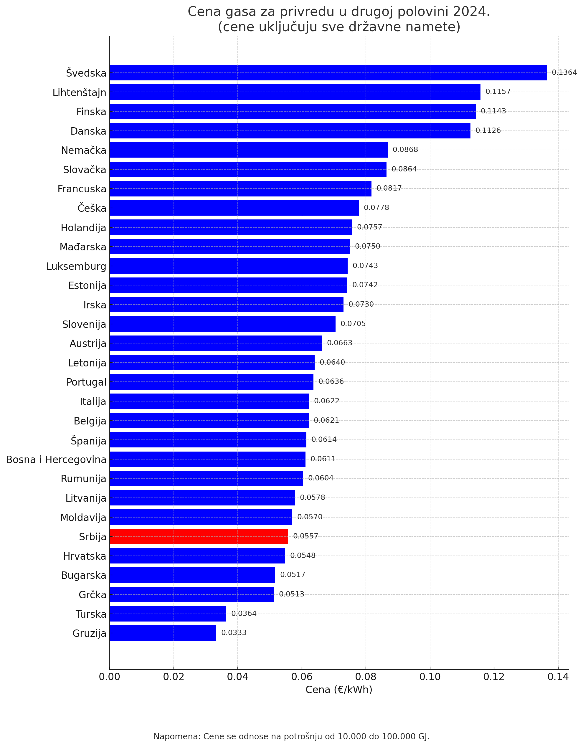 Srbija je pri dnu lestvice i kada je reč o ceni gasa za privredu. Zemlje koje imaju nižu cenu gasa za ovu kategoriju su Gruzija, Turska, Grčka, Bugarska i Hrvatska.