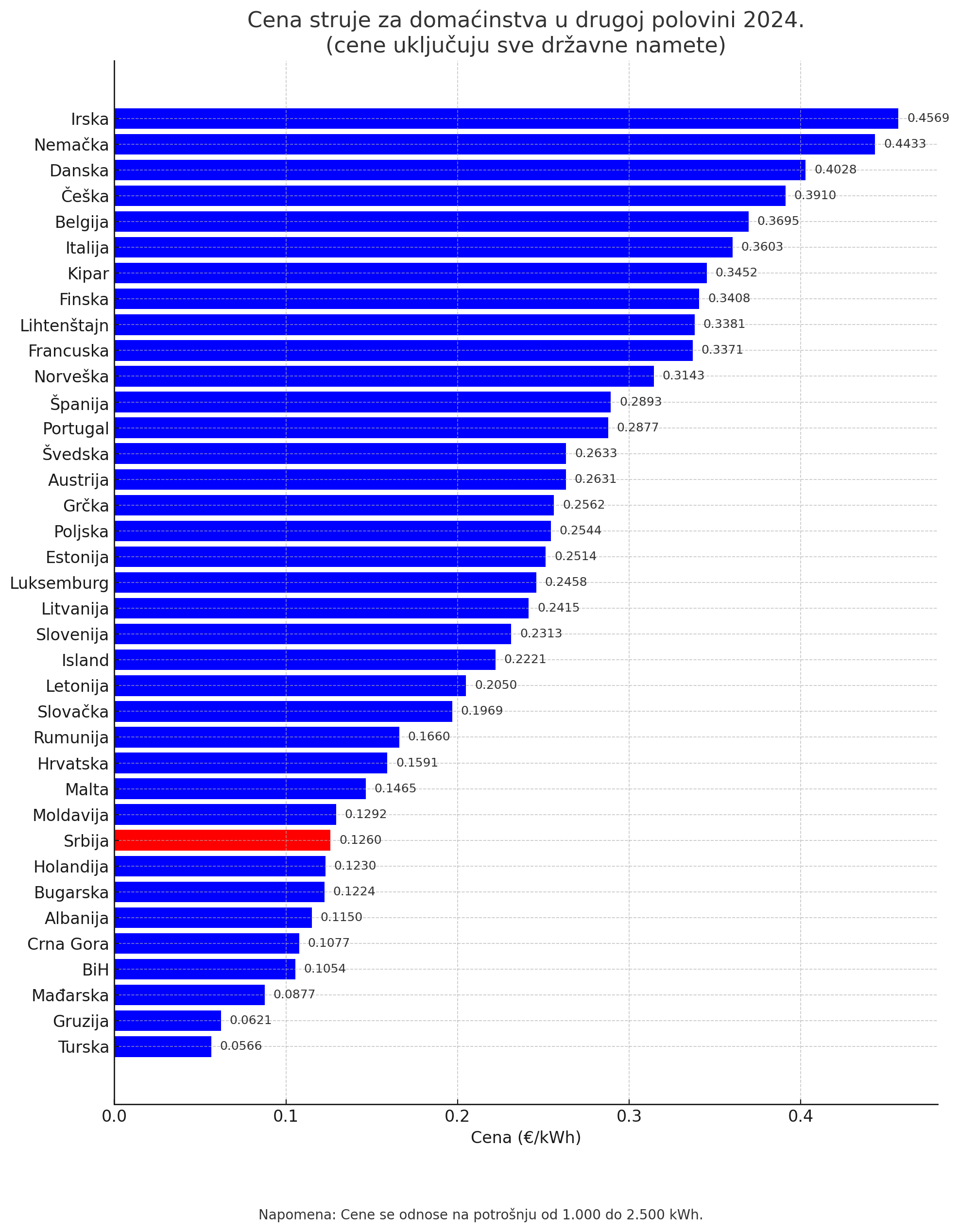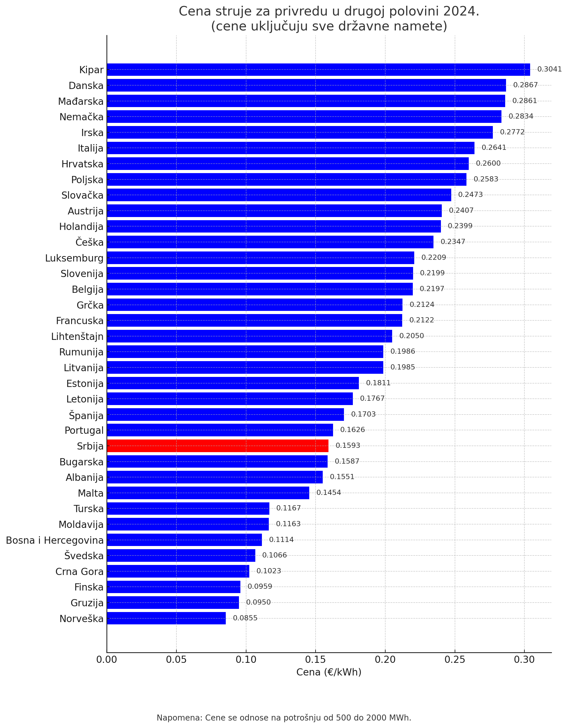 Jeftiniju cenu struje za privredu od Srbije, a koja je iznosila 0,1593 evra po kilovat-času, imale su Norveška, Gruzija, Finska, Crna Gora, Švedska, Bosna i Hercegovina, Moldavija, Turska, Malta, Albanija i Bugarska.