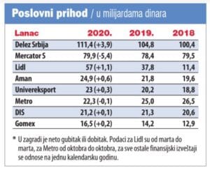 Kompanija Delez u čijem su sastavu marketi Maksi, Tempo i Shop&Go, najveći je pojedinačni igrač na tržištu maloprodaje. Tokom prve pandemijske godine zapošljavao je nešto malo manje od 13.000 ljudi i prihodovao 111,4 milijarde dinara, šest više nego godinu dana ranije.