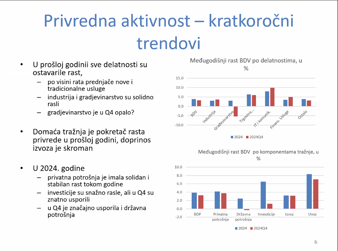 „Rast IT usluga je došao od izvoza, ali su ostale usluge porasle zbog rasta plata i penzija. U prošloj godini je i građevinarstvo ostvarilo rast, ali je u četvrtom kvartalu prošle godine zabeležilo veliki pad. Moram da dodam da sumnjamo u tačnost kvartalnih procena za građevinarstvo, jer pokazuju velike oscilacije i često se ne poklapaju sa drugim pokazateljima“, napomenuo je Arsić.
