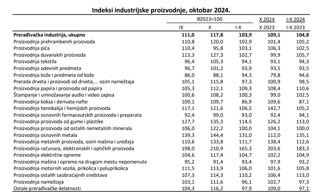 Industrijska proizvodnja je u prvih 10 meseci 2024. godine veća za 3,3 odsto u odnosu na isti period 2023, a u samom oktobru međugodišnji rast proizvodnje iznosi 8,1 odsto. Međugodišnji rast je ostvaren u sva tri sektora, u prerađivačkoj industriji, 9,1 odsto, u snabdevanju električnom energijom, gasom, parom i klimatizaciji, 7,8 odsto i u rudarstvu – 0,4 odsto.