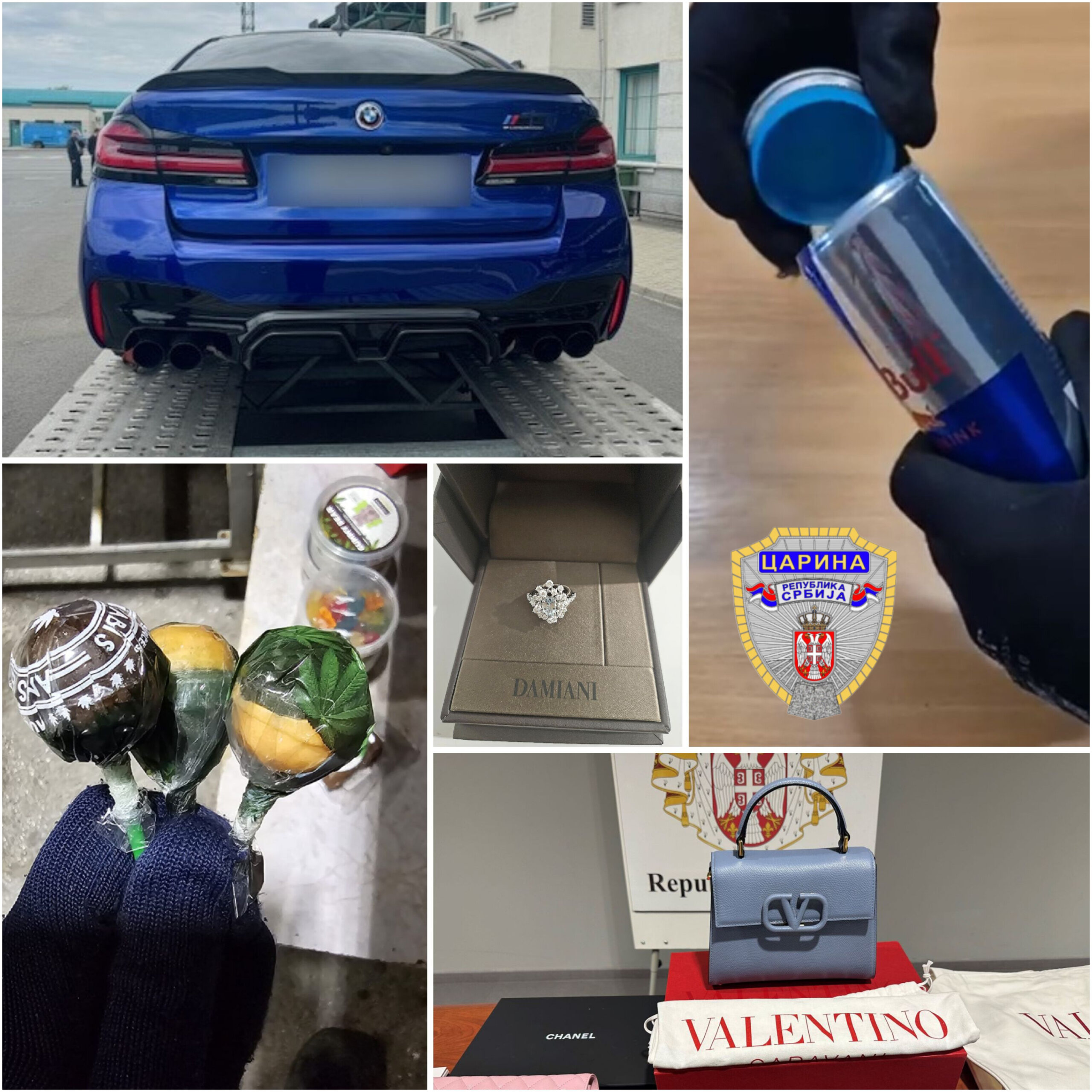 Na graničnim prelazima u Srbije tokom praznika zaplenjena je razna neprijavljena, ali i zabranjena roba – od skupocenog BMW, firmirane garderobe i obuće, marihuane skrivene u energetskom piću, do luksuznog nakita i slatkiša sa kanabisom, saopštila je danas Uprava carine.
