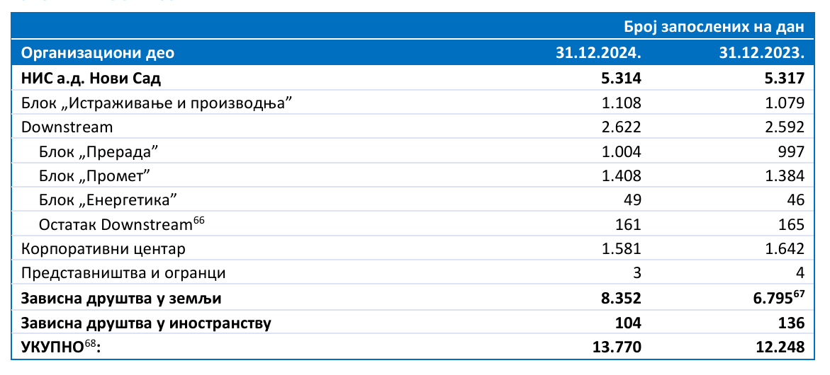 Na kraju 2024. godine ukupan broj zaposlenih u NIS-u iznosio je 13.770, što je za oko 1.500 više u odnosu na broj radnika u 2023. godini.