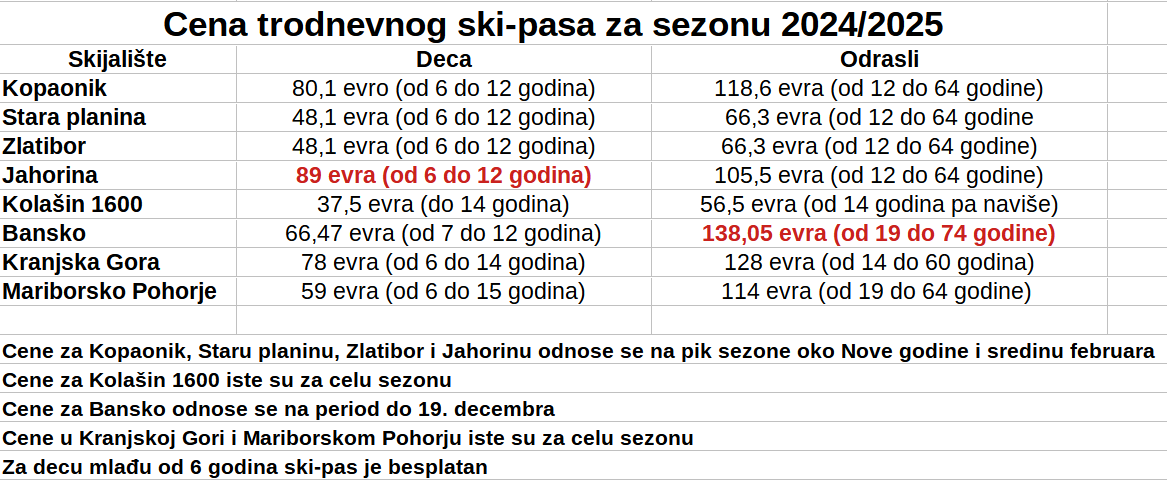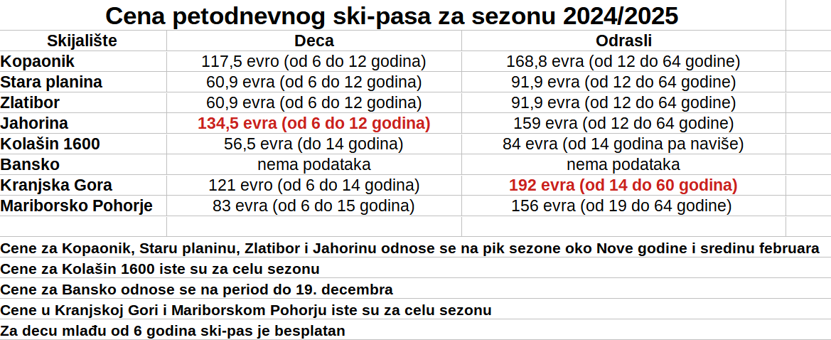 Petodnevni ski-pas za odrasle najskuplji je na Kranjskoj Gori (košta 192 evra) i Kopaoniku (košta skoro 170 evra), a dečiji na Jahorini (134,5 evra) i Kranjskoj Gori (121 evro).