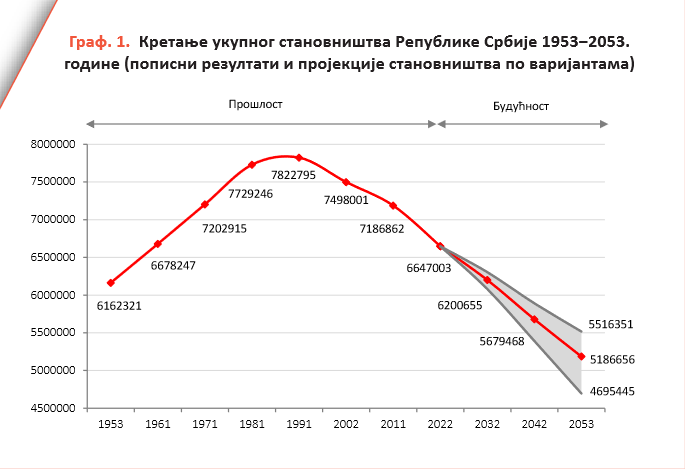 RZS je objavio projekcije stanovništva od 2022. do 2052. godine, prema kojima će u 2052. godini Srbija imati 5,2 miliona stanovnika, što je smanjenje za oko 1,5 miliona u odnosu na 2022. godinu.