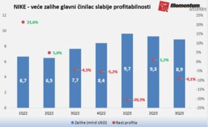 NIKE je u četiri od poslednjih pet fiskalnih kvartala zabeležio pad profita upravo usled visokih zaliha nastalih nakon pandemije kada se kompanija suočila sa pokidanim lancima snabdevanja i ogromnom tražnjom. Nakon objave rezultata akcije NIKE oslabile su skoro pet procenata, ali od početka godine beleže rast od oko tri odsto.