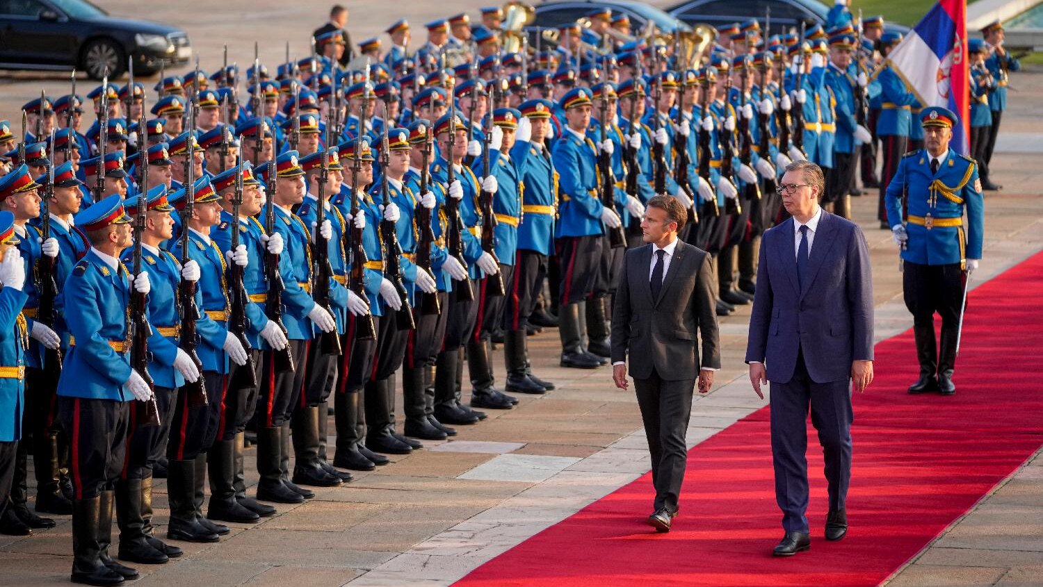 18.30 Makron pristigao na svečani doček ispred Palate Srbija. Francuskom predsedniku je priređen doček uz državne i vojne počasti, uz intoniranje himni „Marseljeza“ i „Bože pravde“, počasnu gardu i plotune.