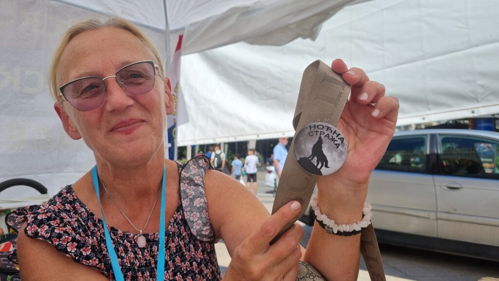 Starija gospođa prolazi, govori da je iz Australije, sviđaju joj se ruske zastave, poručuje da veruje samo ruskim lekarima.