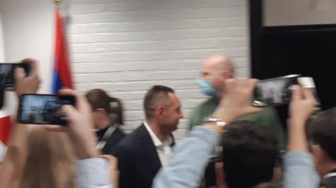 22.12 Uz trubače ulaze članovi SNS u salu sa novinarima proslavljajući pobedu prema do sada još nepotpunim rezultatima koje je objavio RIK, gde ih je dočekao aplauz:
