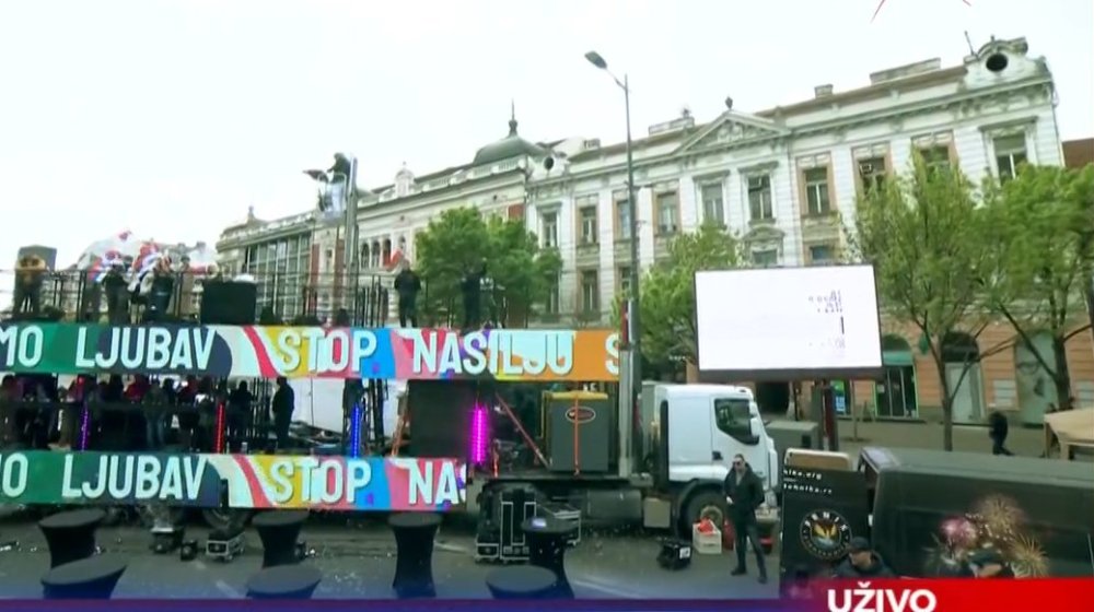 Agencija FoNet javlja da je kod hotela „Moskva“ postavljena je velika di-džej bina “Stop nasilju, samo ljubav”, na kojoj će, kako je najavljeno, muziku puštati vlasnik Pinka Željko Mitrović.