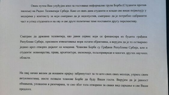 „Studenti traže da gostuju u informativnim emisijama na RTS1, jer smatraju da građani nemaju pravu sliku o ciljevima organizacije Borba. Ukoliko odogovor RTS bude negativan, studenti će zatražiti pomoć Evropske radiofifuzne unije kako bi došli do javnog servisa. Smatraju da građani Srbije nisu dobili prave informacije o izbornoj krađi“, kazala je Cvetković.