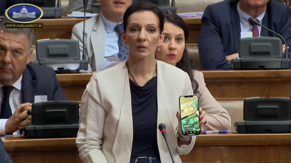 Foto: Printscreen/Youzube/Parlament SrbijaPotpredsednica Stranke slobode i pravde i narodna poslanica Marinika Tepić pokazala je danas u Narodnoj skupštini nove snimke na kojima se, tvrdi ona, nalaze paketi kokaina sa likom predsednika Srbije Aleksandra Vučića.