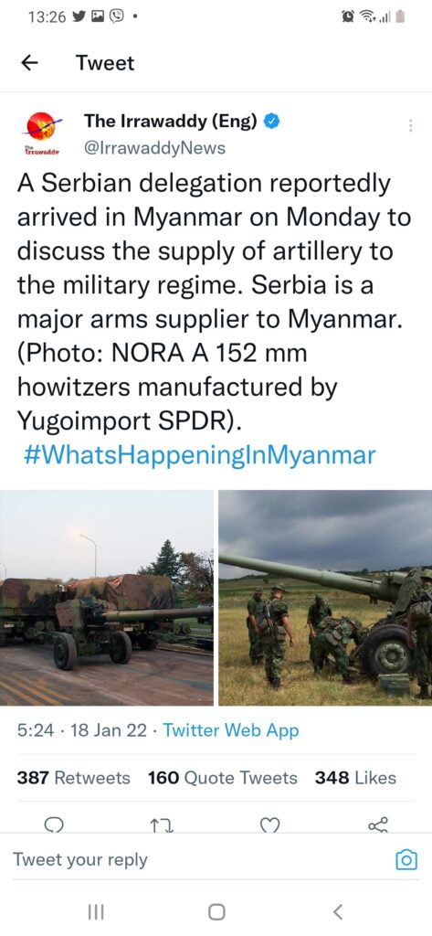 Ova organizacija, koja se opisuje sa odrednicama da ima ključnu ulogu u koordinaciji međunarodne kampanje za oslobađanje Burme, objavila je ovog meseca, u januaru, analizu pod nazivom “Da li Srbija i dalje prodaje oružje vojnoj hunti u Mijanmaru?”, gde se ističe da još od državnog udara 1. februara 2021. godine, postoje neproverene glasine i izveštaji o vojnim kontaktima i snabdevanju i prodaji oružja i vojne opreme mijanmarskoj vojsci.