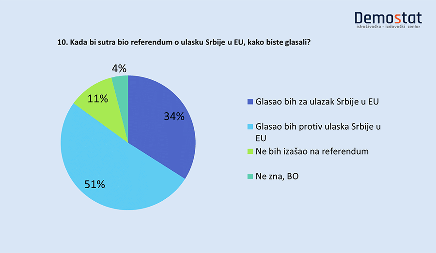 Prema Demostatovom istraživanju, više od polovine ispitanika, njih 56 odsto, smatra da Srbija ne treba da usaglasi svoju spoljnu politiku sa politikom EU, dok ogromna većina ispitanika, njih 80 odsto, veruje da Srbija ne treba da uvede sankcije Rusiji. Takođe, 81 odsto ispitanika veruje da bi Srbija po svaku cenu trebalo da sačuva svoju neutralnost.