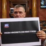 Foto FoNet Milica VučkovićPoslanici dela opozicije danas su, posle postavljanja poslaničkih pitanja, u skupštinskoj sali držali transparente na kojima je pisalo “Mrak u Srbiji, bez slobodnih medija”, u znak podrške televizijama Nova S i N1, koje su noćas prekinule program.