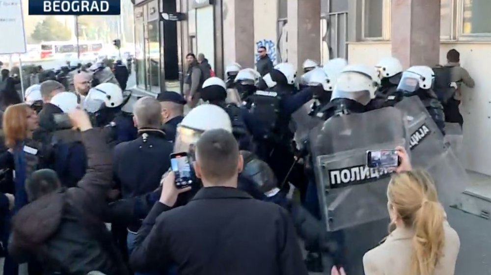 Nemiri su ispred zgrade Skupštine Beograda izbili nešto pre 12 časova. Kako javlja reporter N1, došlo je do tuče okupljenih i obezbeđenja, potom intervencije policije, napetost je trajla 20-tak minuta, a onda se situacija malo smirila, policija se povukla.