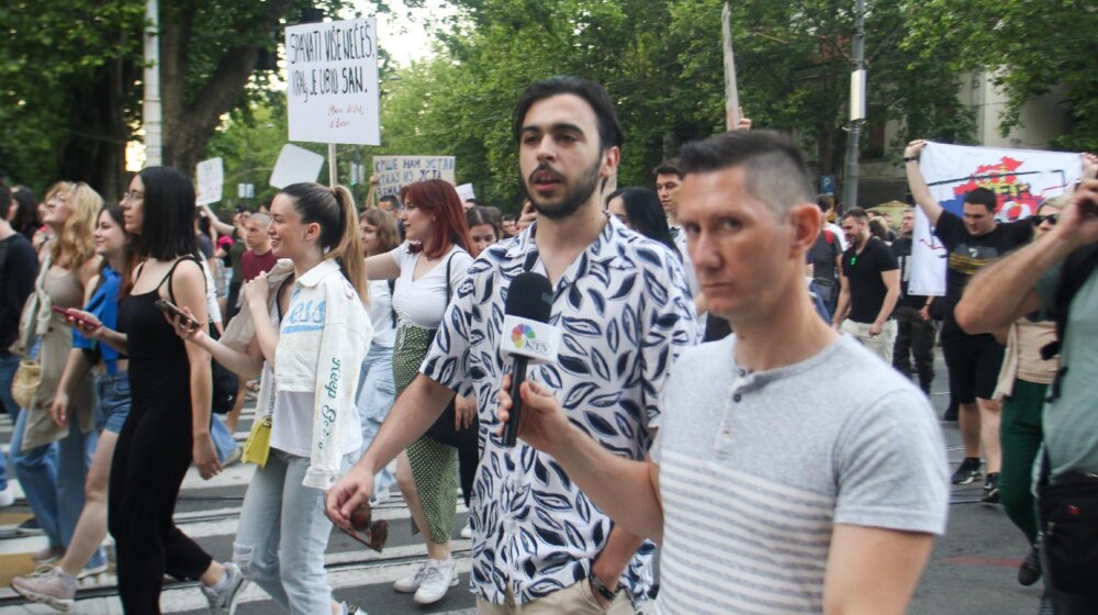 Radovanović (u sredini) daje izjavu Foto: FoNet/Milica VučkovićAdvokati „United Media“ podneli su krivičnu prijavu protiv N.N. lica zbog ugrožavanja sigurnosti Vojina Radovanovića, novinara Danasa.