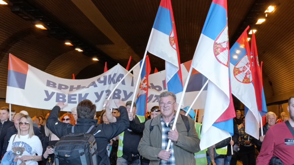„Dajemo podršku našem predsedniku“, odgovara nam građanin koji je deo grupe sa transparentom „Vrnjačka Banja uz Vučića“. Na čelu je kolone, a u ruci nosi zastavu.