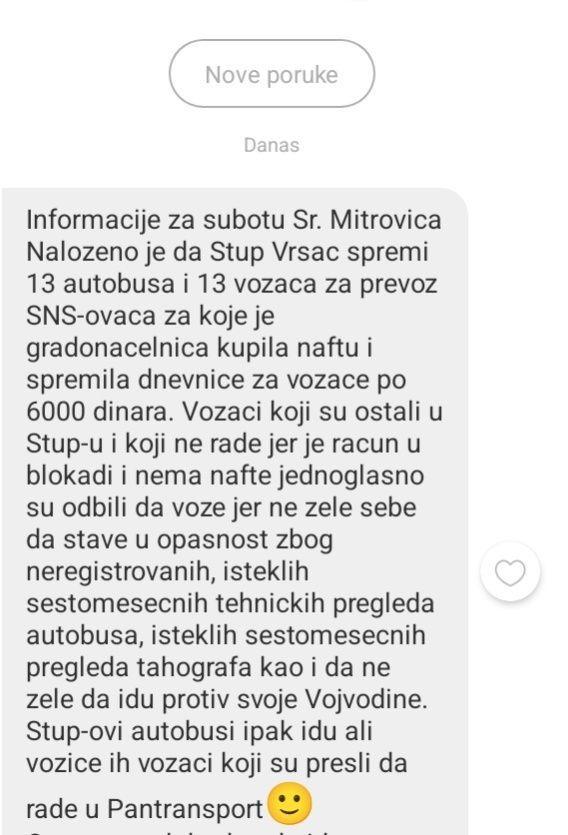„Naloženo je da Stup Vršac spremi 13 autobusa i 13 vozača za prevoz SNS-ovaca za koje je gradonačelnica (Dragana Mitrović) kupila naftu i spremila dnevnice za vozače po 6.000 dinara. Vozači koji su ostali u Stup-u i koji ne rade jer je račun u blokadi i nema nafte jednoglasno su odbili da voze, jer ne žele sebe da stave u opasnost zbog neregistrovanih, isteklih šestomesečnih tehničkih pregleda autobusa, isteklih šestomesečnih pregleda tahografa kao i da ne žele da idu protiv svoje Vojvodine“, navodi se u objavi.
