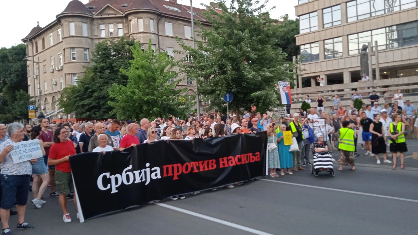 19.34 Simljan Banjac, konferansije skupa, ispred Narodne skupštine u Beogradu, ponovo je pročitao zahteve protesta: „Zahtevamo zastuavljanje promocije nasilja u javnom prostoru, a to znači momentalna smena svih članova REM-a, hitno emitovanje rijaliti programa i programa koji promovišu nasilje i nemoral na TV sa nacionalnom frekvencijom, zabrana štampanih medija koji promovišu nasilje i agresiju i krše novinarski kodeks, smena rukovodstva RTS zbog emitovanja programa koji promovišu nasilje kriminal i agresiju, oduzimanje frekvencije televiziji Pink i Hepi, zbog kršenja zakona, zbog agresije i nemorala, takođe zahtevamo i smenu Bratislava Gašića koji se krije iza ove Skupštine, smena šefa BIA Aleksandra Vulina. I s obzirom na činjenicu da je temperatura kakva jeste i da smo spremni za šetnju, pozivamo da se uputimo do Palate pravde, gde će nam se obratiti Zoran Ivošević, sudija Vrhovnog suda.“ Banjac je najavio da će blokada Mostarske petlje potom trajati do 22 sata.