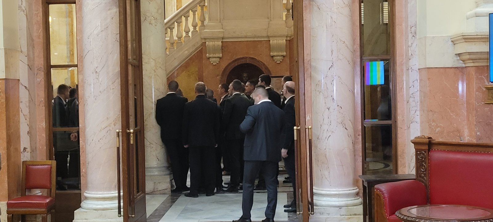 9.40 Kako javlja reporter N1 na ulazu u Skupštinu detaljno se pretresaju svi koji ulaze. Pojedinim poslanicima opozicije oduzeta i hrana. Reporter Danasa navodi da je na ulazu i na hodnicima vidno pojačano prisustvo skupštinskog obezbeđenja. U holu Narodne skupštine za sada su prisutne samo novinarske ekipe, a za razliku od jučerašnjeg dana nije najavljena nijedna konferencija za medije.