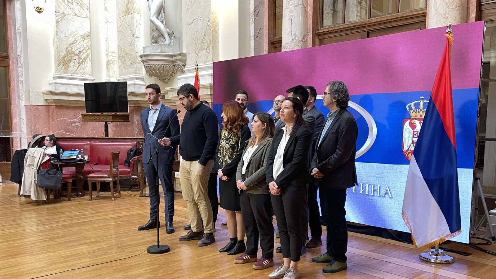 11.04 Dok poslanici vlasti neometano govore u sali, u holu su se postrojili poslanici opozicije iz SSP da se obrate novinarima.