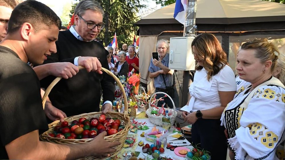 „Divno ste ovo spremali, hvala vam za osmehe i sve ovo i što brinite o ovoj deci“, zahvalio je Vučić ženama na štandovima na kojima su bili kolači, jaja i ručni radovi.