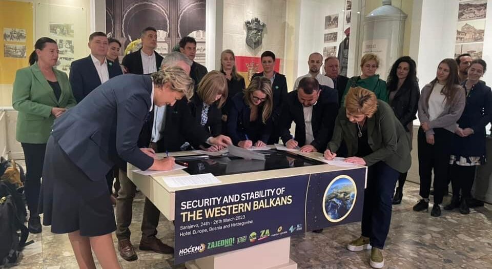 Foto: Stranka ZajednoStranka Zajedno saopštila je danas da su zelene političke stranke Zapadnog Balkana potpisale, u Sarajevu, Deklaraciju o njihovoj saradnji, kojom su se obavezale na izgradnju trajnog mira na Balkanu, vođene idejom o stabilnosti i sigurnosti kao preduslovima za ekonomski razvoj, borbu protiv korupcije i vladavinu prava.