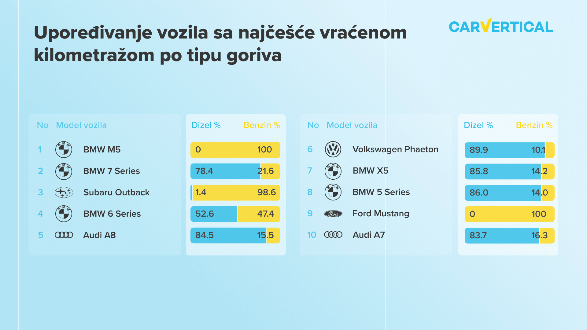 „Lista automobila sa najčešće vraćenom kilometražom sastoji se uglavnom od premium vozila, ali ima i modela ekonomske klase, ali sa manjim učešćem u ukupnom broju modela. Automobili Subaru, Ford i Folksvagen pripadaju istoj starosnoj grupi kao i vozila više klase. Čini se verovatnije da će automobili stari od pet do 15 godina biti kompromitovani po pitanju broja pređenih kilometara“.