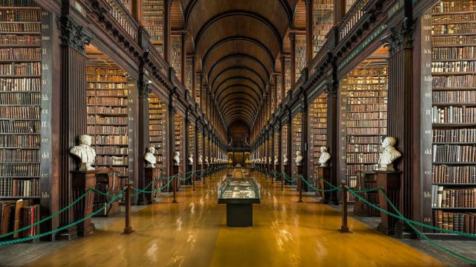 Prvi je BIBLIOTEKA TRINITI KOLEDŽA Univerziteta u Dablinu. Ispostaviće se da je to ne samo jedna od najvećih, najstarijih i najobimnijih svetskih biblioteka (1592) sa takvim arsenalom antikvarnih knjiga koji broji preko 250 hiljada primeraka od kojih je najpoznatiji Keltski manuscript (početak 9. veka). Pored tri zgrade „Stare biblioteke“ fond od preko tri miliona knjiga smešten je u osam odvojenih zgrada. Unutrašnjost „duge sobe“ predstavlja pravo iznenađenje za svakog ko stupi u nju. Pored ogromnog i nepreglednog niza starih knjiga u kožnim povezima sa obe strane dugog, širokog hola, na visokim stalažama poređanih na dvema galerijama od kojih gornja seže do plafona koji liči na unutrašnjost ogromne kace ili bureta u kome je spavao sam Guliver u zemlji Liliputanaca… Duž stubova su biste najznačajnijih svetskih pisaca od Sokrata do Šekspira i DŽonatana Svifta, čiju bistu smatraju najlepšoj u celoj kolekciji. Ja sam pobrojao 42. Mada nigde nisam našao podatak ko je sve među njima i koliko ih stvarno ima. Kad bih ubrajao ovaj doživljaj u deset mojih svetskih čuda, ova biblioteka bi bila na tom spisku.