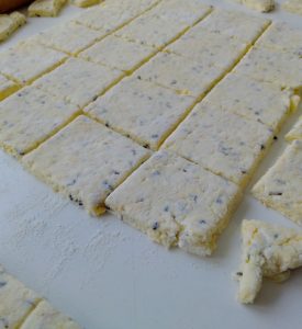 Razvijte ga na površini koju ste posuli brašnom oko 7-8 mm debljine i isecite na komade željene veličine.