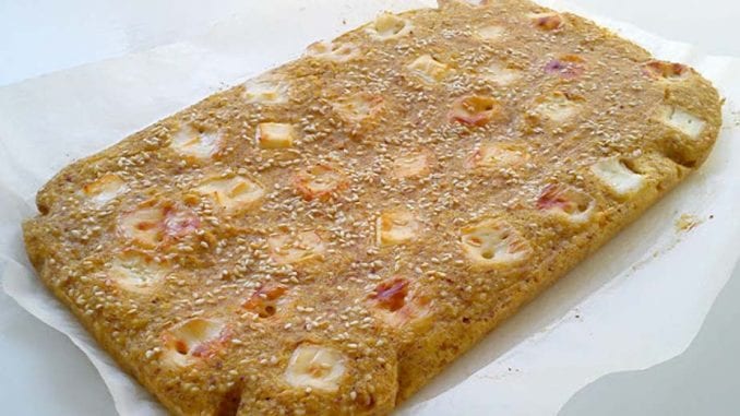 Izlijte u pleh okvirnih dimenzija 20*30 cm koji ste prethodno obložili papirom za pečenje.