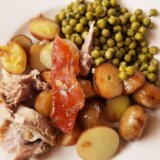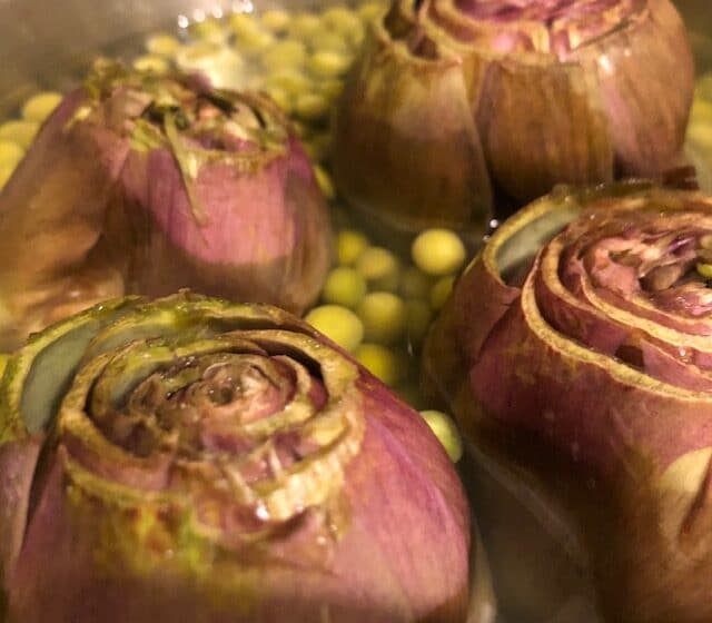 Način pripreme: Artičoke očistiti tako da im se uklone donji delovi latica, potom taj donji deo odseče, takođe i 1/3 gornjeg dela latica odseče. Limunom premazati te delove. Nakon toga pomešati sitno naseckan beli luk, peršun i prezle. Dobijenom smesom puniti artičoke između latica. Uposudu za kuvanje staviti grašak šećerac, pa na povrće staviti artičoke. U posudu sipati maslinovim ulje potom vodu, do sredine artičoka, potom so i biber, dodati pola količine belog vina, a na pola kuvanja dodati ostatak vina ukoliko ga stavite. Kuvati na laganoj vatri oko 50 minuta. Na tanjir servirati artičoku, razmaknuti latice i garnirati graškom. |