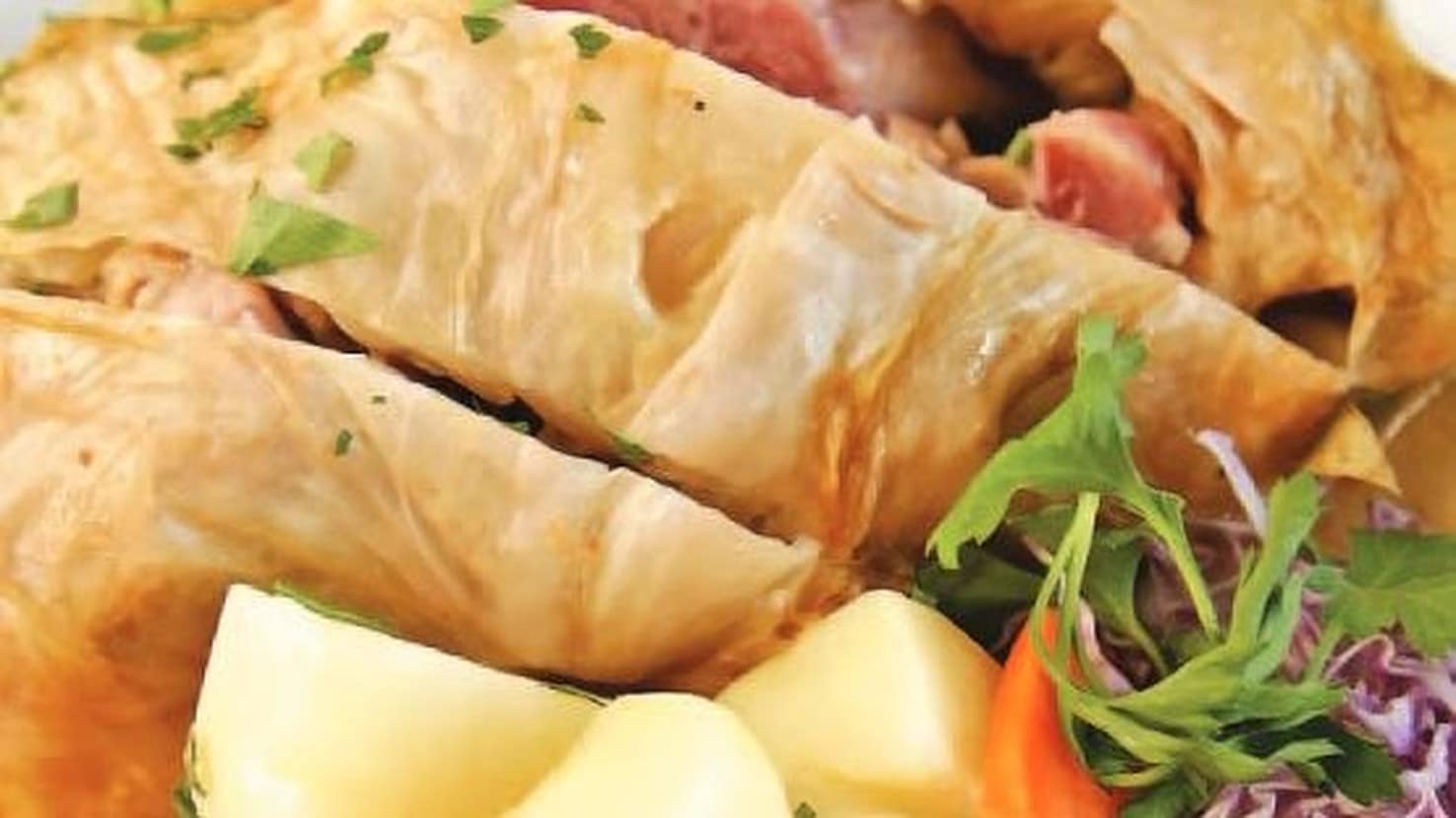 Suve svinjske „noge“ se upakuju u ove listove, „paketi“ poređaju u vatrostalni sud, a okolo ušuškaju učetvorena crca od kupusa, takođe učetvoren kilogram krompira i nekoliko suvih, što slatkih, što ljutih paprika. Sve se zaspe biberom u zrnu i alevom paprikom, zamasti i nalije s malo vode, pa prepustri rerni na najmanje dva sata na 200 stepeni.
