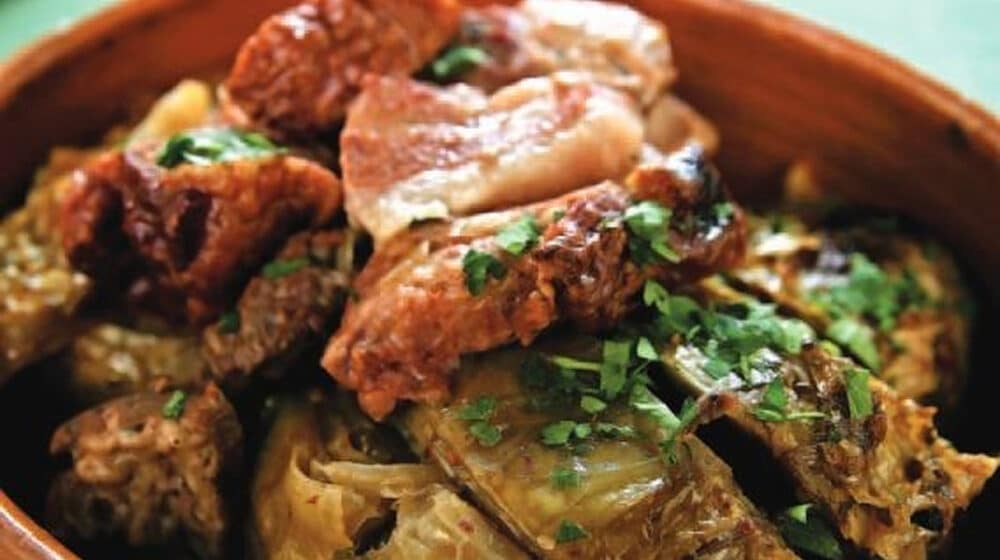 Sve se još zatvori aluminijumskom folijom, da dobro dihtuje, pa pripusti rerni da se krčka na niskoj temperaturi: 150 do 175 stepeni. Tako najmanje četiri sata, kada se skloni ona folija, rerna uključi na jaču vatru, pa sve po ukusu još malo zapeče.