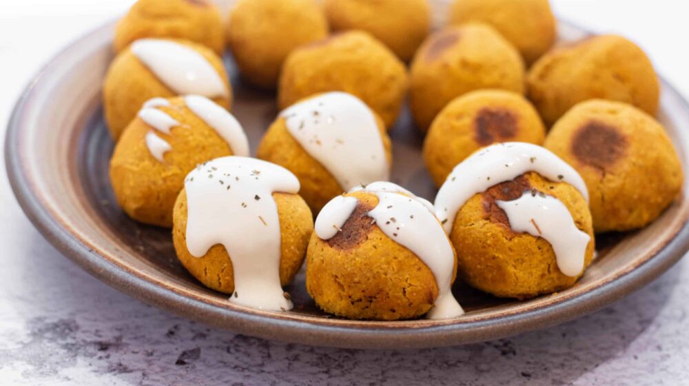 Formirajte kuglice vlažnim rukama, poređajte ih na pek papir i premažite ih maslinovim uljem.