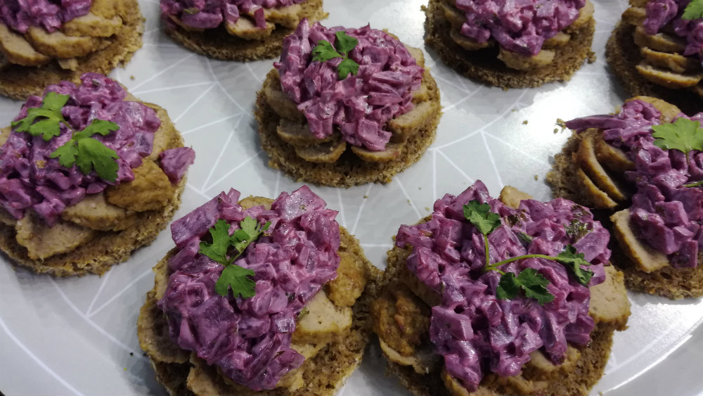Isecite integralni baget na kolutove, ćufte na režnjeve, pa slažite sendviče. Hleb, 1-2 isečene ćufte, pa na vrh salata od cvekle. Ukrasite naseckanim peršunom ili narom.