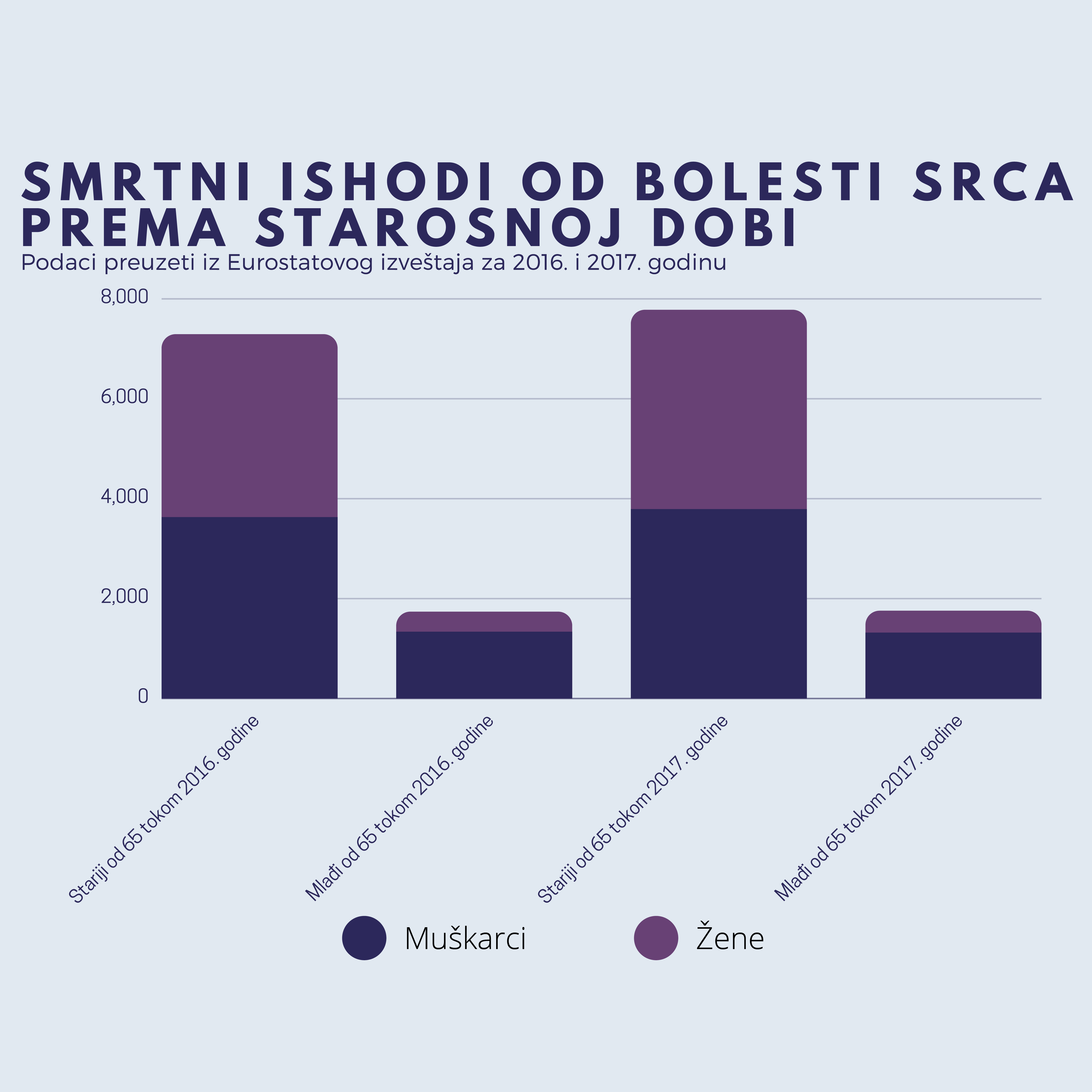 Ukoliko posmatramo statistiku prema starosnoj dobi, veći broj slučajeva smrtnog ishoda od bolesti srca zabeležen je kod starijih od 65 godina, dok se kod mlađih primećuje drastična razlika na relaciji polova. Kod muškaraca mlađih od 65 godina zabeleženo je tokom 2016. godine, odnosno 2017. godine, 1.327 slučajeva (odnosno 1.309), dok je kod žena taj broj znatno manji, 397 slučaja (odnoso 434).