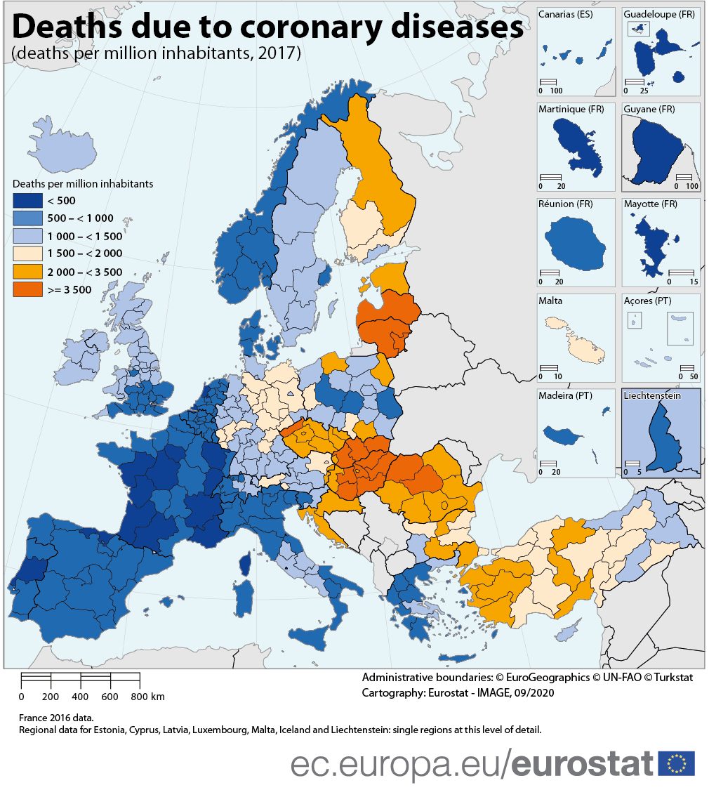 Na regionalnom nivou (NUTS 2), region „Centralni i Zapadni” u Litvaniji registrovao je najveću stopu smrtnosti od srčanih udara sa 5.706 umrlih na milion stanovnika, zatim mađarski region „Severna Mađarska” (4.597) i rumunski region „Severozapad” (4.393).